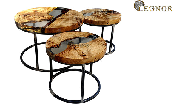 Round coffee table set poplar wood triple coffee table set with clear resin Dimensions Dia 60 cm D 50 cm  D 45 cm  Materials Poplar Natural Wood , epoxy, Resin, MetalView more